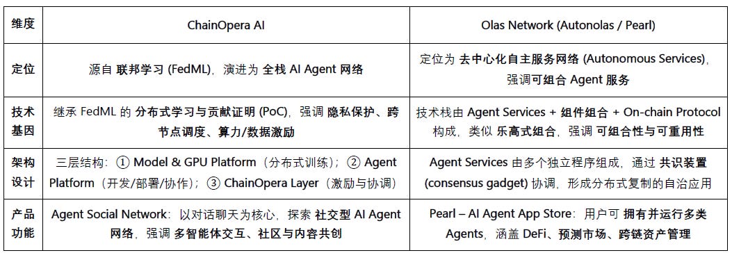 在Agent网络层面,业内最有代表性的项目是Olas Network。ChainOpera 前者源自联邦学习,构建模型—算力—智能体的全栈闭环,并以 Agent Social Network 为实验场探索多智能体的交互与社交协作;Olas Network源于 DAO 协作与 DeFi 生态,定位为去中心化自主服务网络,通过 Pearl推出可直接落地的Defi收益场景,与ChainOpera展现出截然不同的路径。