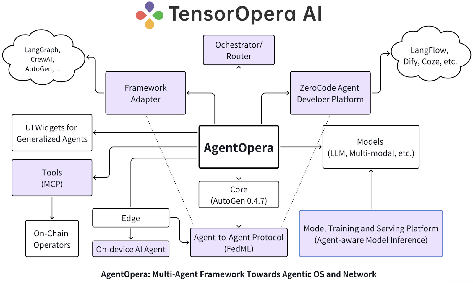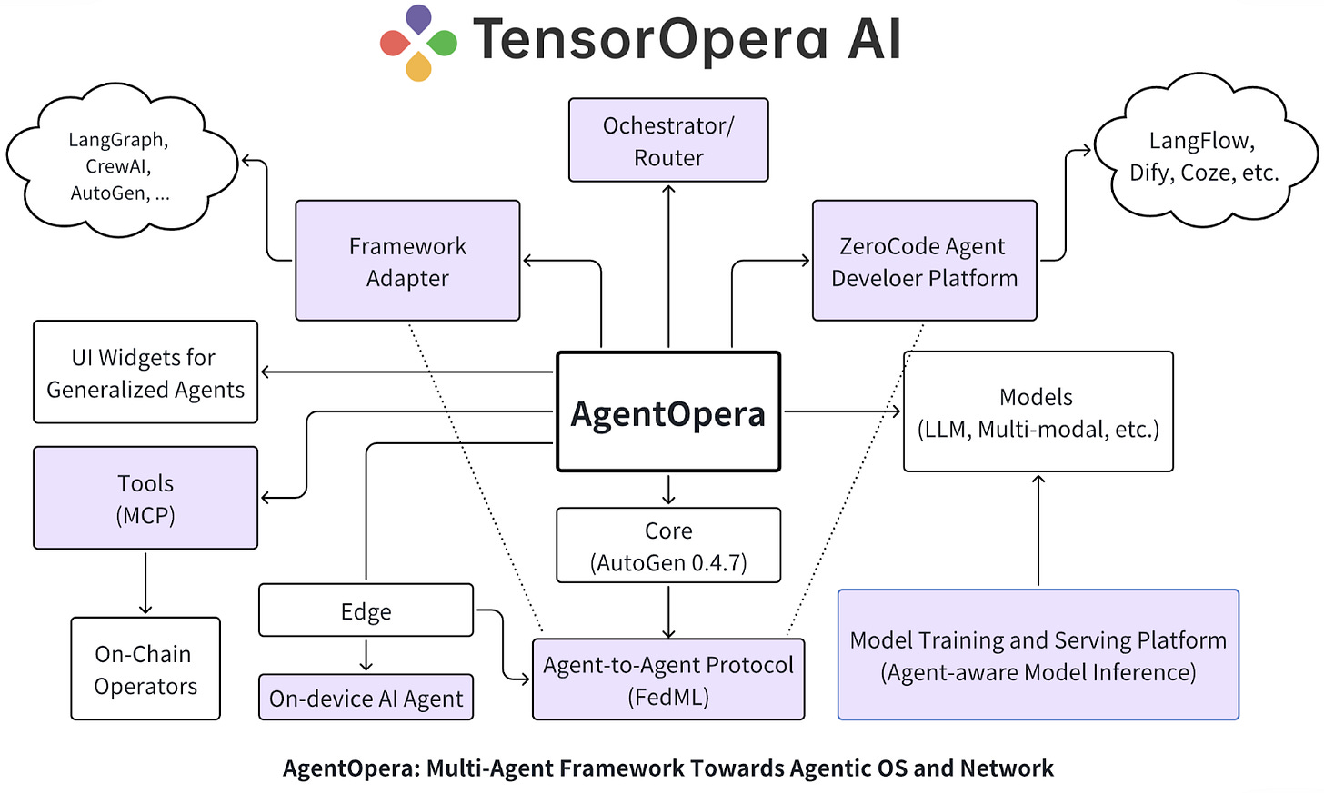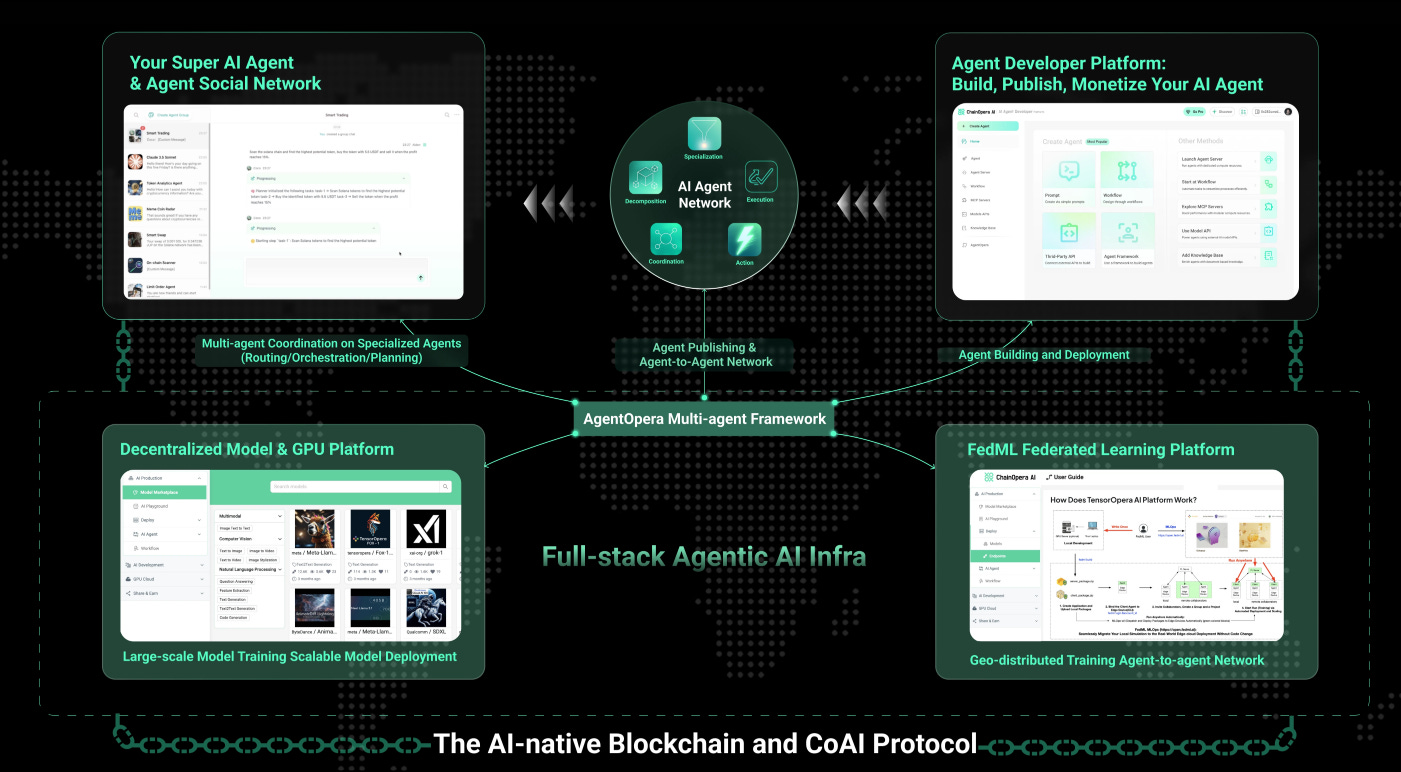 2025年3月,TensorOpera 升级为面向 AI Agent 的全栈平台,核心产品涵盖 AgentOpera AI App、Framework 与 Platform。应用层提供类 ChatGPT 的多智能体入口,框架层以图结构多智能体系统和 Orchestrator/Router 演进为“Agentic OS”,平台层则与 TensorOpera 模型平台和 FedML 深度融合,实现分布式模型服务、RAG 优化和混合端云部署。整体目标是打造 “一个操作系统,一个智能体网络”,让开发者、企业与用户在开放、隐私保护的环境下共建新一代 Agentic AI 生态。