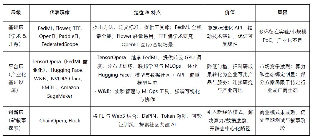 在产业化与基础设施层,TensorOpera(FedML 商业化)的特点在于继承开源 FedML 的技术积累,提供跨云 GPU 调度、分布式训练、联邦学习与 MLOps 的一体化能力,目标是桥接学术研究与产业应用,服务开发者、中小企业及 Web3/DePIN 生态。总体来看,TensorOpera 相当于 “开源 FedML 的 Hugging Face + W&B 合体”,在全栈分布式训练和联邦学习能力上更完整、通用,区别于以社区、工具或单一行业为核心的其他平台。