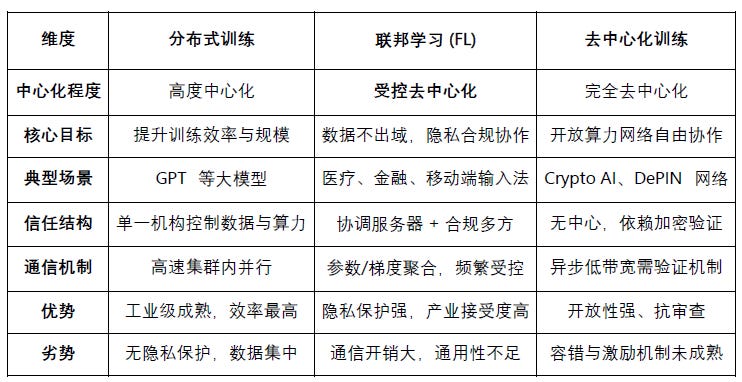 联邦学习(Federated Learning, FL) 是一种在不集中数据的前提下进行协同训练的框架,其基本原理是由各参与方在本地训练模型,仅上传参数或梯度至协调端进行聚合,从而实现“数据不出域”的隐私合规。经过医疗、金融和移动端等典型场景的实践,联邦学习 已进入较为成熟的商用阶段,但仍面临通信开销大、隐私保护不彻底、设备异构导致收敛效率低等瓶颈。与其他训练模式相比,分布式训练强调算力集中以追求效率与规模,去中心化训练则通过开放算力网络实现完全分布式协作,而联邦学习则处于二者之间,体现为一种 “受控去中心化” 方案:既能满足产业在隐私与合规方面的需求,又提供了跨机构协作的可行路径,更适合工业界过渡性部署架构。