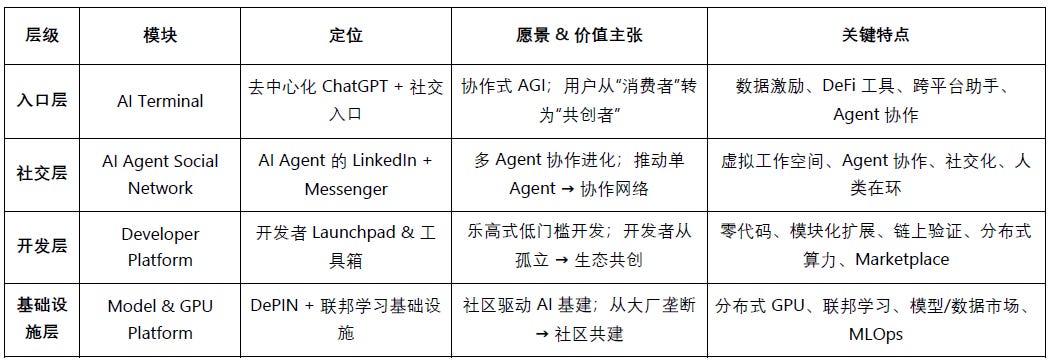 作为基础设施层,结合 DePIN 与联邦学习,解决 Web3 AI 依赖中心化算力的痛点。通过分布式 GPU、隐私保护的数据训练、模型与数据市场,以及端到端 MLOps,支持多智能体协作与个性化 AI。其愿景是推动从“大厂垄断”到“社区共建”的基建范式转移。