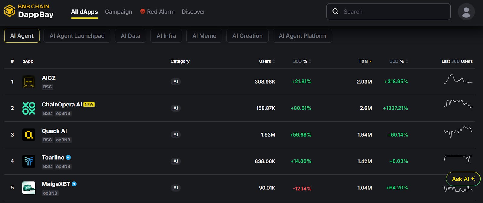 根据BNB DApp Bay 近 30 日的链上数据显示,其独立用户 158.87K,近30日交易量260万,在在 BSC「AI Agent」分类中排名全站第二,显示出强劲的链上活跃度。