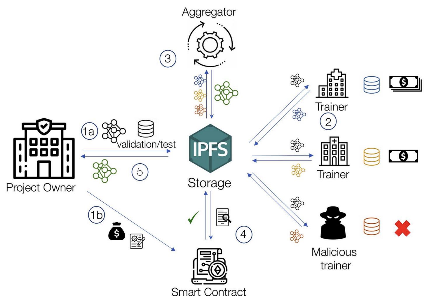 Proof-of-Intelligence (PoI) 是 ChainOpera 在 CoAI 协议下提出的核心共识机制,旨在为去中心化 AI 构建提供透明、公平且可验证的激励与治理体系。其基于Proof-of-Contribution(贡献证明) 的区块链协作机器学习框架,旨在解决联邦学习(FL)在实际应用中存在的激励不足、隐私风险与可验证性缺失问题。该设计以智能合约为核心,结合去中心化存储(IPFS)、聚合节点和零知识证明(zkSNARKs),实现了五大目标:① 按贡献度进行公平奖励分配,确保训练者基于实际模型改进获得激励;② 保持数据本地化存储,保障隐私不外泄;③ 引入鲁棒性机制,对抗恶意训练者的投毒或聚合攻击;④ 通过 ZKP 确保模型聚合、异常检测与贡献评估等关键计算的可验证性;⑤ 在效率与通用性上适用于异构数据和不同学习任务。