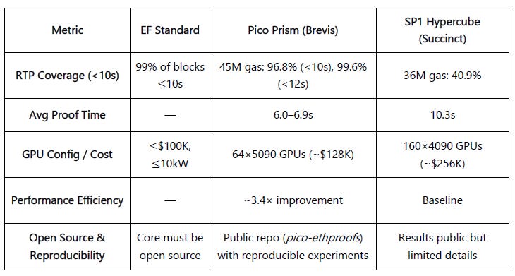 96.8% <10s coverage, 99.6% <12s coverage for 45M gas blocks, significantly outperforming Succinct SP1 Hypercube (36M gas, 10.3s average, 40.9% <10s coverage) With 71% lower latency and half the hardware cost, Pico Prism demonstrated a 3.4× improvement in performance-per-dollar efficiency.