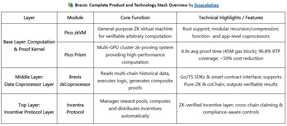 Brevis builds a multi-chain verifiable computing layer by integrating its general-purpose zkVM (Pico/Prism) with a data coprocessor (zkCoprocessor).