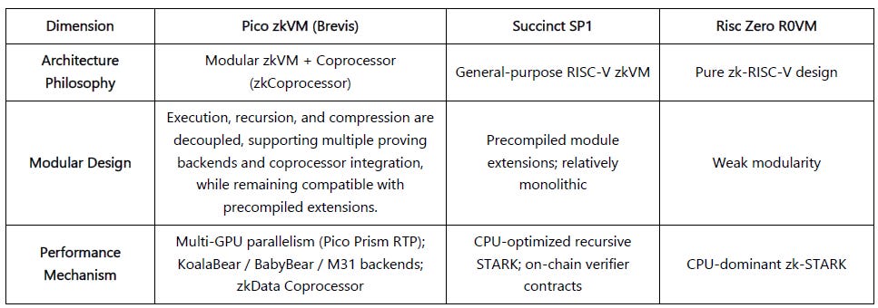 Compared to Succinct’s SP1 (a relatively monolithic RISC-V zkVM) and Risc Zero R0VM (a universal RISC-V execution model), Pico’s Modular zkVM + Coprocessor System decouples execution, recursion, and compression phases, supports backend switching, and enables coprocessor integration—yielding superior performance and extensibility.