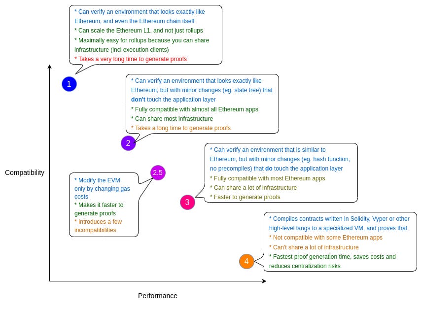 Type 2.5: EVM-equivalent except for gas costs — adjusts gas pricing for ZK-unfriendly operations to improve prover efficiency while maintaining broad compatibility (e.g., Polygon zkEVM, Kakarot).