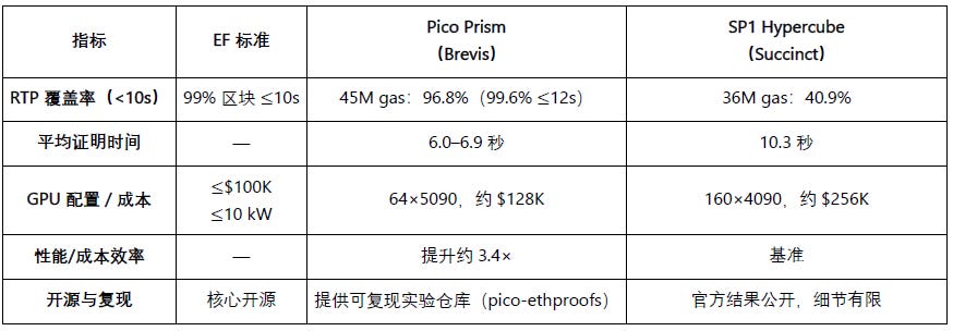 硬件策略: 在 64×RTX 5090 GPU(约 $128K)配置下,Pico Prism 实现 6.0–6.9 秒平均证明时间、96.8% RTP 覆盖率,性能/成本比提升约 3.4 倍,较 SP1 Hypercube(160×4090 GPU,10.3 秒)表现更优。