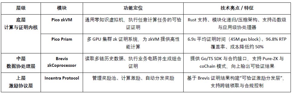 Brevis 以「通用 zkVM(Pico/Prism)」与「数据协处理器(zkCoprocessor)」构建多链可信计算层:前者解决任意计算可验证问题,后者实现历史与跨链数据的业务落地。