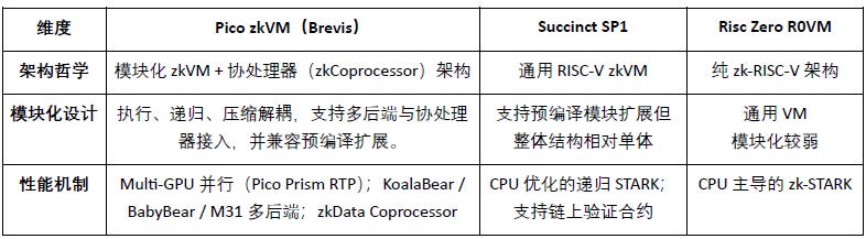相较于 Succinct SP1 的相对单体化 RISC-V zkVM 架构和 RISC Zero R0VM 的通用 RISC-V 执行模型,Pico 通过 Modular zkVM + Coprocessor System 实现执行、递归与压缩阶段的解耦与扩展,支持多后端切换及协处理器集成,在性能与可扩展性上形成差异化优势。