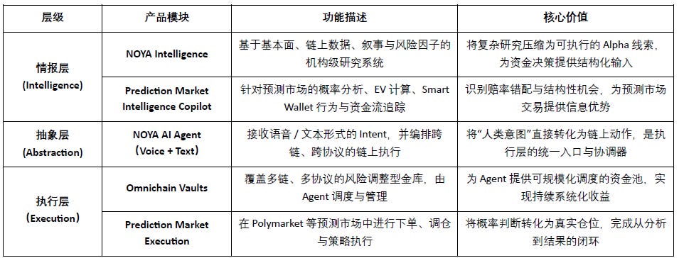 在产品形态上,NOYA 支持被动收益型用户、主动交易者以及预测市场参与者等不同参与方式,并通过 Omnichain Execution、AI Agents & Intents、Vault Abstraction 等设计,将多链流动性管理、复杂策略执行与风险控制模块化、自动化。