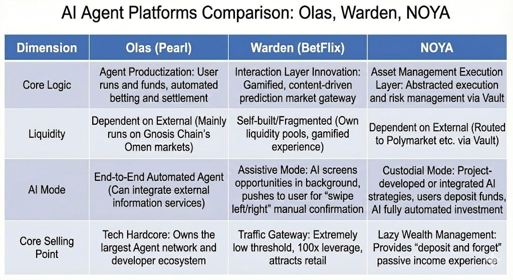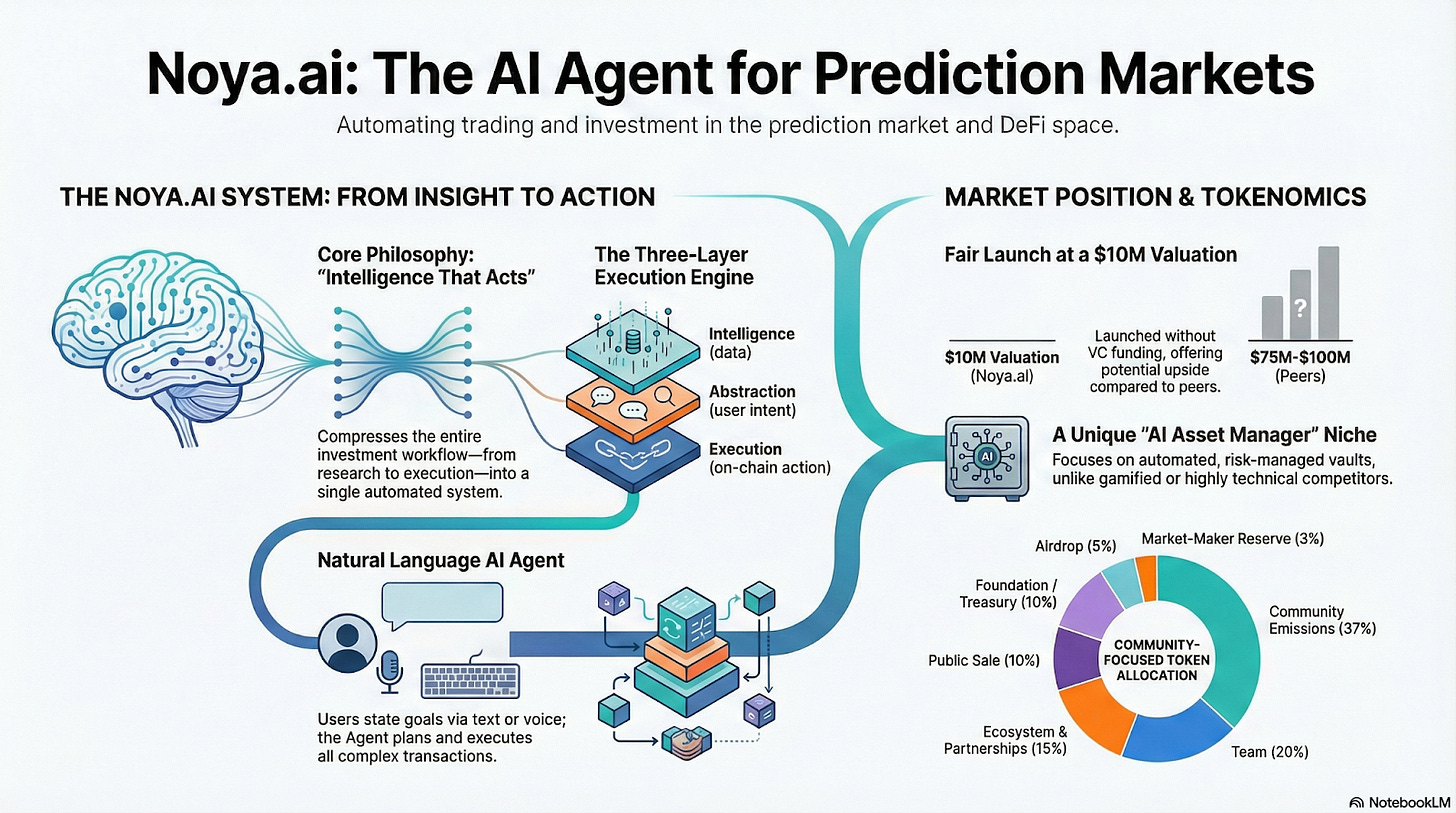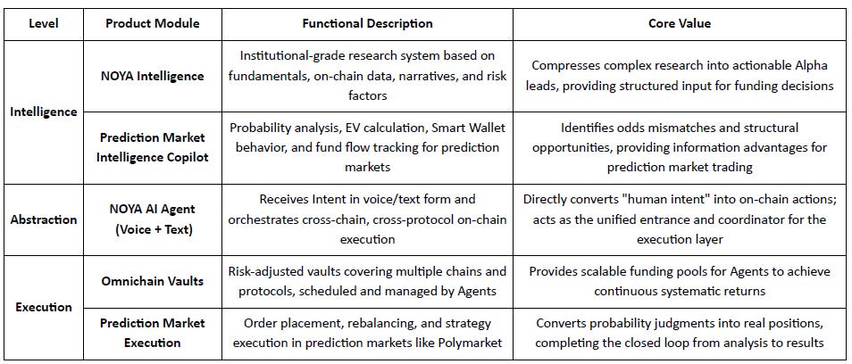 NOYA.ai: Centered on “Fund Custody + Strategy Execution on Behalf,” abstracting prediction markets and DeFi execution into asset management products through Vaults, providing a participation method with low operation and low mental burden. If the Prediction Market Intelligence and Agent execution modules are superimposed later, it is expected to form a “Research—Execution—Monitoring” integrated workflow