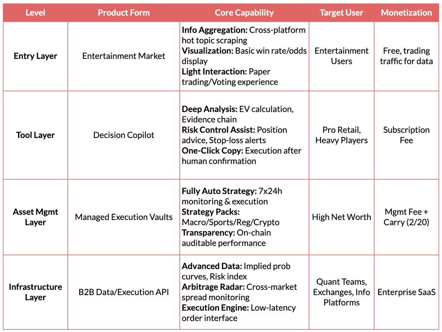 Infrastructure Layer: Provides multi-source real-time data aggregation, Smart Money address libraries, unified prediction market execution engines, and backtesting tools. Charges B2B fees to obtain stable revenue unrelated to prediction accuracy.