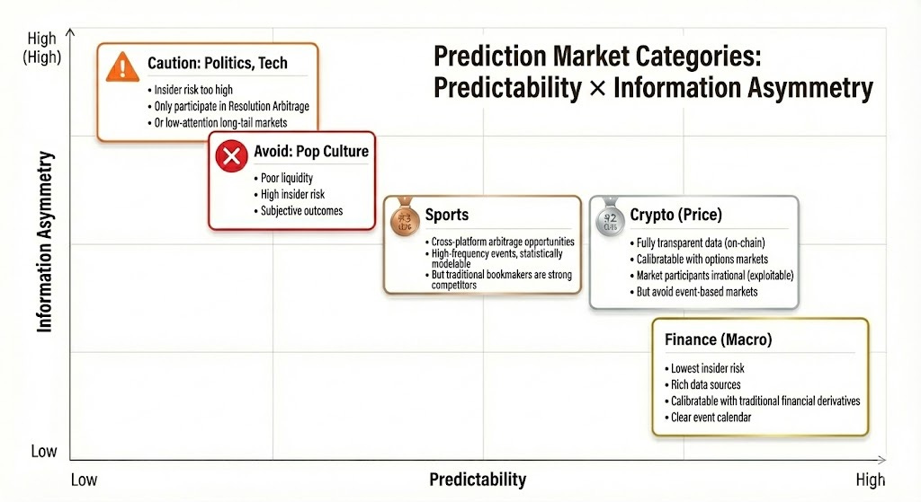 Not all prediction markets have tradable value. Participation value depends on: Settlement Clarity (are rules clear, is the data source unique), Liquidity Quality (market depth, spread, and volume), Insider Risk (degree of information asymmetry), Time Structure (expiration time and event pacing), and the trader’s own Information Advantage and Professional Background. A prediction market only has a basis for participation when most dimensions meet basic requirements. Participants should match based on their own strengths and market characteristics: