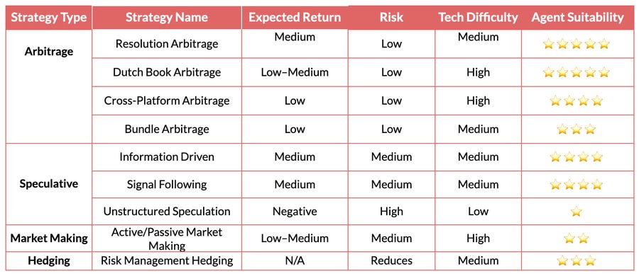 Bundle Arbitrage: Exploits pricing inconsistencies between related contracts. Logic is clear but opportunities are limited. Can be executed by Agents but requires some engineering for rule parsing and portfolio constraints. Agent suitability is medium.