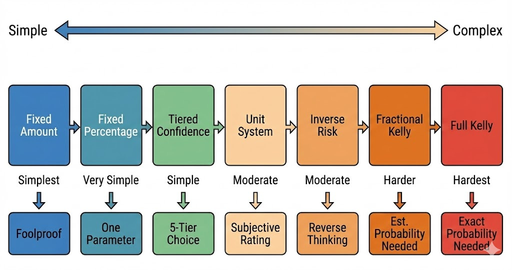 Unit System: Splits capital into fixed units (e.g., 1%) and invests different numbers of units based on confidence levels. This automatically constrains single-bet risk through a unit cap and is the most common practical method.